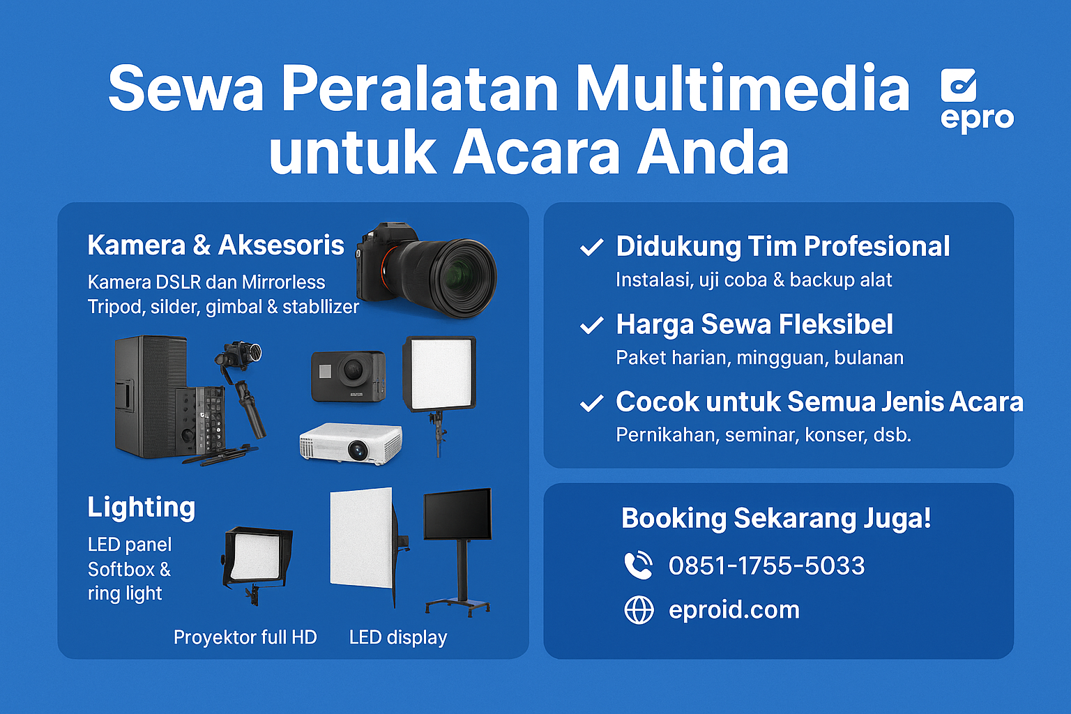 The success of an event is highly dependent on the multimedia equipment used. Epro is here as a complete solution for event equipment rental needs throughout Indonesia. Starting from cameras, sound systems, lighting to projectors-all available and ready to be used professionally. 🔧 Available Multimedia Equipment Here are the tools that you can rent at […]