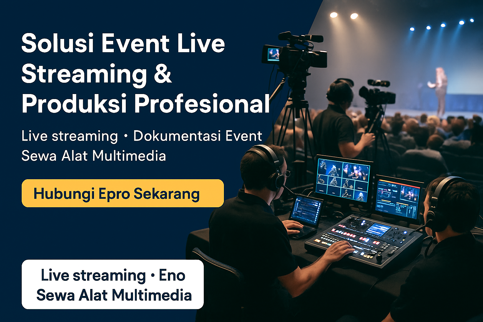 Epro adalah penyedia layanan profesional untuk live streaming event, produksi multimedia, dan sewa peralatan yang telah dipercaya oleh ratusan klien di Indonesia. Kami hadir untuk menjawab kebutuhan Anda akan dokumentasi dan siaran langsung berkualitas tinggi, kapan pun dan di mana pun.